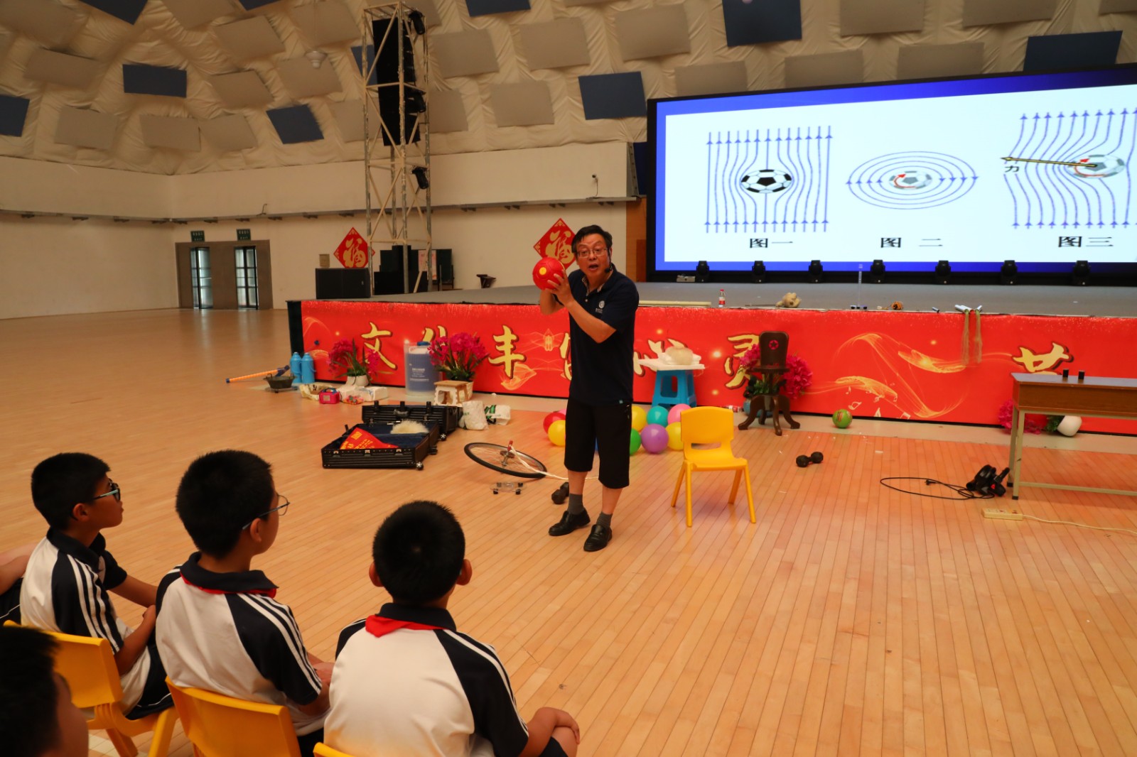 仲教授告诉大家“科学就在身边”,“科学是美的”。他用生动形象的语言讲述了什么是物理学、生活中的物理现象等科学知识,并为同学们演示了电磁转化、力的作用、能量转换、声音传播、椅子旋转、摩擦起电等多个物理实验。